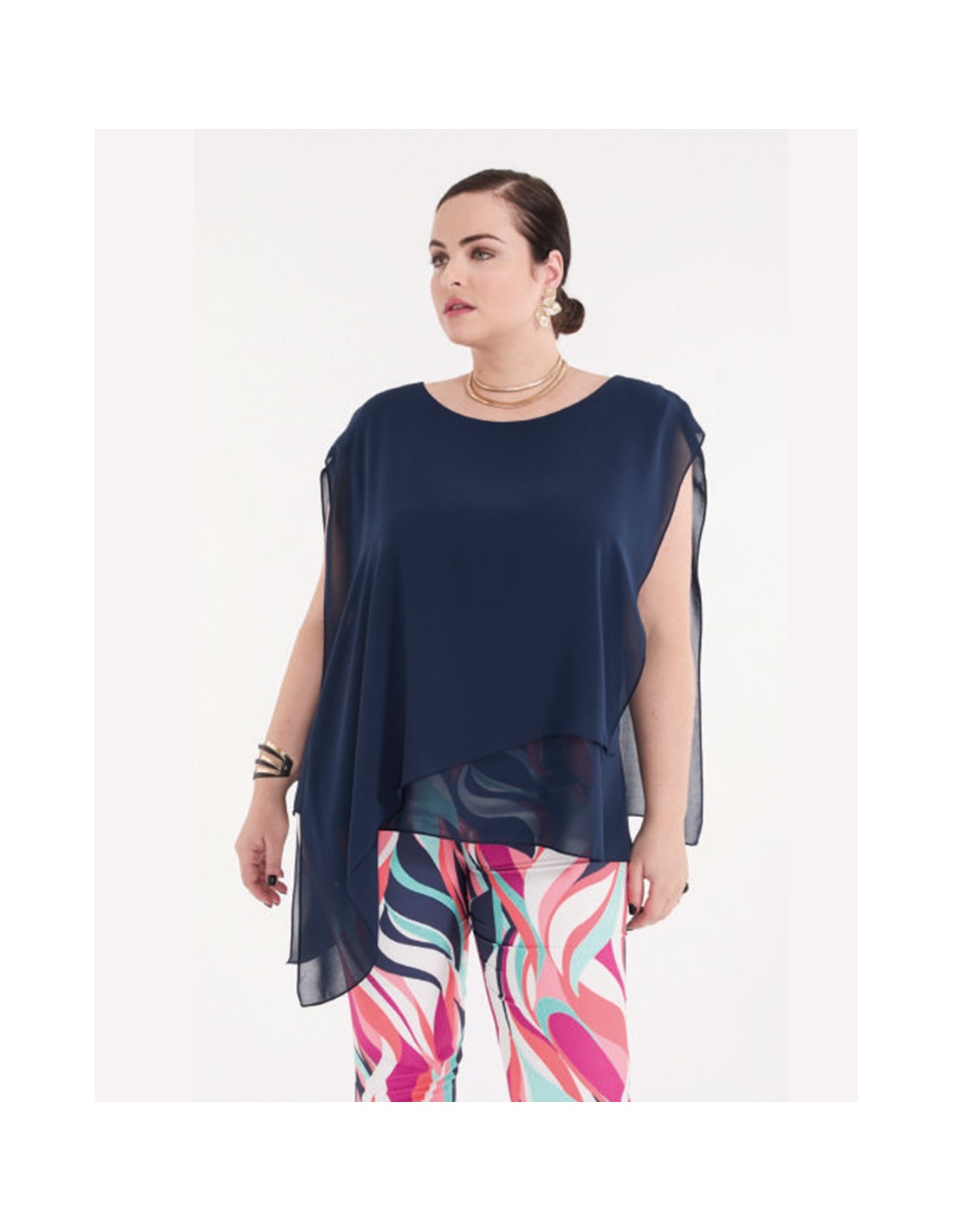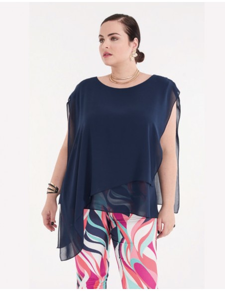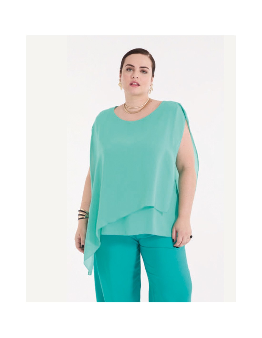 Top liso de gasa con forma asimétrica, escote redondo y capa en delantero y espalda con aberturas laterales y fruncido en un hombro.